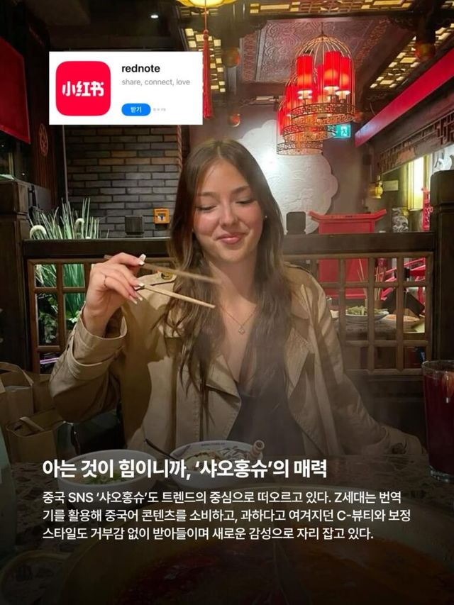 중국 SNS ‘샤오홍슈’도 트렌드의 중심으로 떠오르고 있다. Z세대는 번역기를 활용해 중국어 콘텐츠를 소비하고, 과하다고 여겨지던 C-뷰티와 보정 스타일도 거부감 없이 받아들이며 새로운 감성으로 자리 잡고 있다.