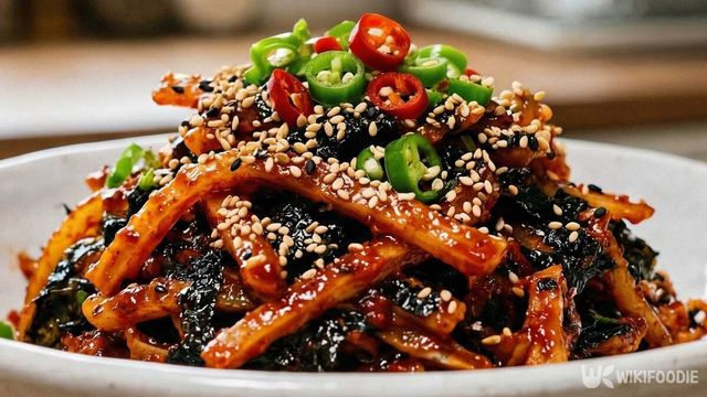 김은 철분과 요오드, 비타민 A가 풍부한 해조류다. 갑상선 기능 유지와 빈혈 예방에 도움을 주면서도 열량이 낮아 부담 없이 먹을 수 있다. 구운 김은 특유의 바다 향과 고소한 풍미가 강해 양념과 만나면 감칠맛이 훨씬 살아난다. 직화로 구운 곱창김을 쓰면 고소함이 더 진하게 올라오고 일반 김밥김이나 마른김을 써도 충분히 맛있다. 함께 들어가는 진미채는 오징어를 얇게 찢어 말린 것으로 타우린이 풍부해 피로 회복에 좋고 쫄깃한 식감이 무침에 씹는 재미를 더해준다.