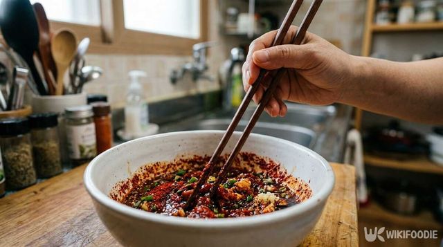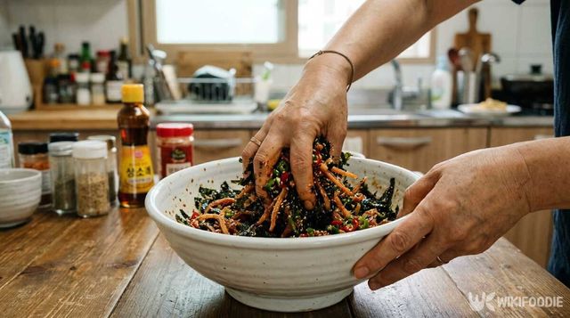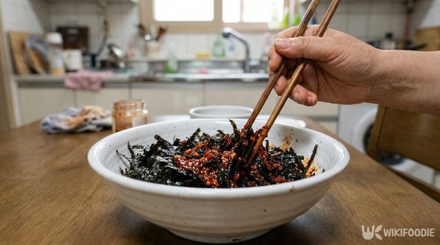 양념장이 완성되면 부순 김을 가장 먼저 넣고 뒤적인다. 김이 양념을 먼저 흡수하면서 촉촉하게 불어나는 이 단계가 무침의 풍미를 좌우한다. 김이 양념에 어느 정도 스며들었으면 물기를 짠 진미채를 넣고 조물조물 무친다. 청양고추 2개를 잘게 다져 넣으면 칼칼한 맛이 살아나고 홍고추 1개를 다져 넣으면 색감이 살아난다. 마지막으로 참기름 1큰술, 깻가루 1큰술, 통깨 1큰술을 넣고 가볍게 버무리면 완성이다. 참기름은 반드시 마지막에 넣어야 향이 날아가지 않는다.
