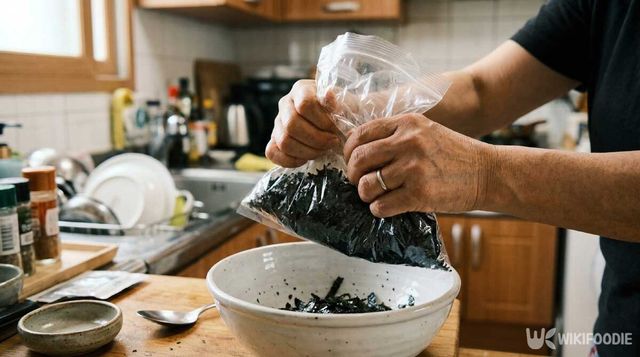 진미채는 찬물에 한 번 헹궈 손으로 꽉 짠 뒤 3cm 안팎으로 잘라둔다. 시판 진미채에는 염분이 배어 있는 경우가 많아 헹구지 않으면 무침 전체가 짜진다. 김 10장은 사등분으로 잘라 비닐봉지에 넣고 손으로 잘게 부순다. 엄지손톱 크기 정도로 부수면 양념과 섞었을 때 뭉치지 않고 고루 배어든다.