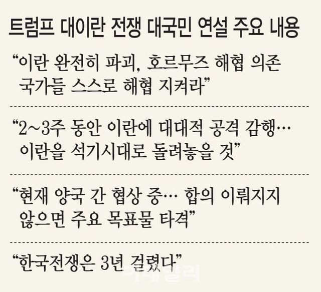 트럼프 대통령은 사실상의 승리 선언과 함께 종전까지의 시한을 “앞으로 2~3주”라고 암시하며 이 기간에 “그들을 극도로 강력하게 타격할 것이다. 석기시대로 돌려놓겠다”고 예고했다. 동시에 그는 이란의 새 정권과 종전 협상을 진행하고 있다고도 전했다. 하지만 이 정권이 이란 국민의 지지를 받고 있는 세력인지는 여전히 불분명하다. 기존 이란 집권층은 협상 자체를 부인하고 있다. 전문가들은 설령 전쟁이 끝나더라도 에너지·원자재 공급 위기는 상당 기간 이어질 것이라고 경고했다.