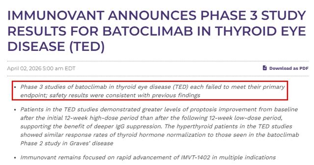 한올바이오파마의 파트너사인 이뮤노반트(IMVT)는 2일(현지시간) 자사 홈페이지를 통해 "TED 성인 환자를 대상으로 한 바토클리맙의 임상 3상 결과 해당 약물이 1차 평가변수를 모두 충족하지 못했다"며 "파트너사인 한올바이오파마와 바토클리맙 개발에 대한 향후 계획을 검토하고 추후 한올과 공동으로 프로그램 진행상황에 대해 업데이트하겠다"고 밝혔다.