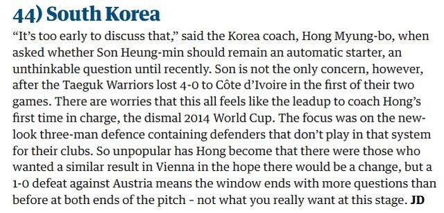 한국은 최근 평가전에서 코트디부아르에 0-4로 완패했는데, 가디언은 이를 두고 대표팀 전반의 문제를 드러낸 결과로 해석했다.