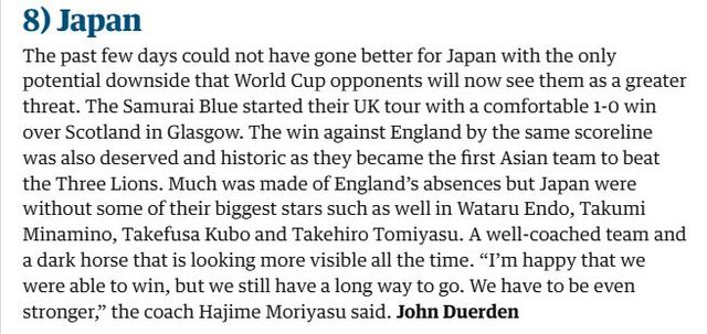 '가디언'은 일본이 스코틀랜드와 잉글랜드를 상대로 연승을 거둔 점을 높이 평가하며 "점점 더 위협적인 다크호스"라고 표현했다. 특히 모리야스 하지메 감독이 이끄는 조직력과 전술 완성도를 강점으로 꼽았다.