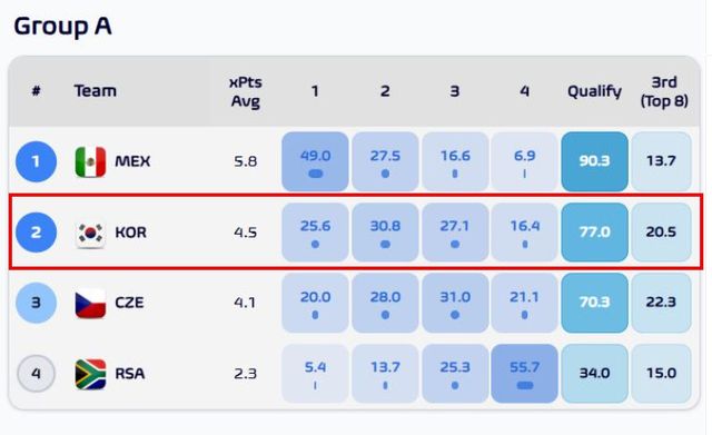 '풋볼 미츠 데이터'는 A조의 경우 멕시코가 평균 승점 5.8점을 기록하며 조 1위가 되고, 한국의 평균 승점 4.5점으로 멕시코에 이어 조 2위로 32강행 열차에 탑승할 것으로 예상했다. 평균 승점 4.1점의 체코가 3위지만 좋은 성적으로 토너먼트에 진출할 수 있을 거고, 남아공은 평균 승점 2.3점으로 조별리그 탈락이 예상된다는 게 이 매체가 내놓은 결과다.