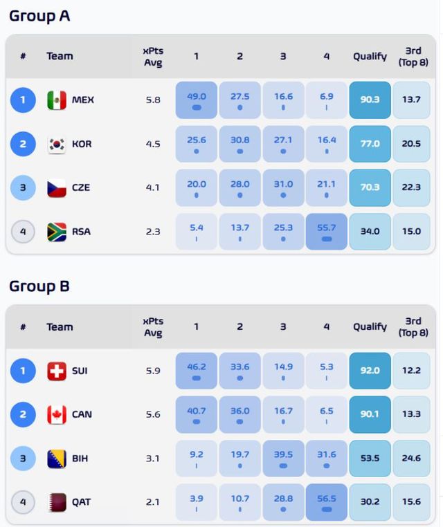 축구 통계 매체 '풋볼 미츠 데이터'는 2일(한국시간) 시뮬레이션을 통해 도출한 2026 FIFA 북중미 월드컵 A조와 B조의 결과를 공개했다.