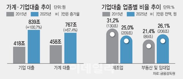 절대 규모로도 이러한 흐름이 뚜렷하다. 제조업 대출은 2015년 130조원에서 지난해 209조원으로 증가하는 데 그쳤지만, 부동산 임대업 대출은 같은 기간 89조원에서 218조원으로 늘어나며 증가 속도에서 차이를 보였다. 기업대출 확대의 상당 부분이 부동산 관련 대출 증가에 의존하고 있는 것이다.