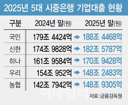 2일 금융권에 따르면 지난해 우리은행의 기업대출잔액은 148조 2483억원으로 1년 전(154조 952억원)에 비해 5조 8469억원 감소했다. KB국민은행(179조 4424억→188조 4468억), 신한은행(174조 9828억→182조 5787억), 하나은행(161조 9584억→170조 9428억), 농협은행(142조 7942억→148조 9305억) 등 다른 은행들이 기업대출을 늘린 것과 대조적이다. 5대 은행 합산으로 보면 기업대출은 한 해 25조 8751억원 순증했다. 특히 지난해 하나은행, 국민은행의 기업대출잔액은 약 9조원씩 순증했다.