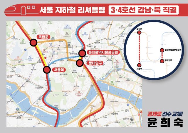 대신 기존 노선을 연결해 강북에서 강남까지 환승 없이 이동할 수 있도록 하겠다는 구상이다. 4호선 동대문역사공원역과 3호선 동대입구역을 약 600m로 연결하고, 3호선 독립문역과 서울역을 약 2.5㎞ 구간으로 이어 북부권에서 강남권까지 무환승 이동이 가능하도록 하겠다는 계획이다. 통상 1㎞당 1000억 원 수준의 예산이 드는 점을 감안하면, 강북횡단선 예상 비용인 2조 원 대비 비용을 크게 줄일 수 있는 사업이라는 취지다.