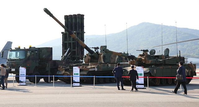 경기도 성남시 서울공항에서 개막한 '2023 서울 항공우주방위산업전시회(ADEX)' 야외전시장에 우리 군의 핵심 무기들이 전시돼 있다. 왼쪽부터 천궁-II, K-9A1 자주포, K2 전차. / 2023년 10월 17일자 뉴스1 사진