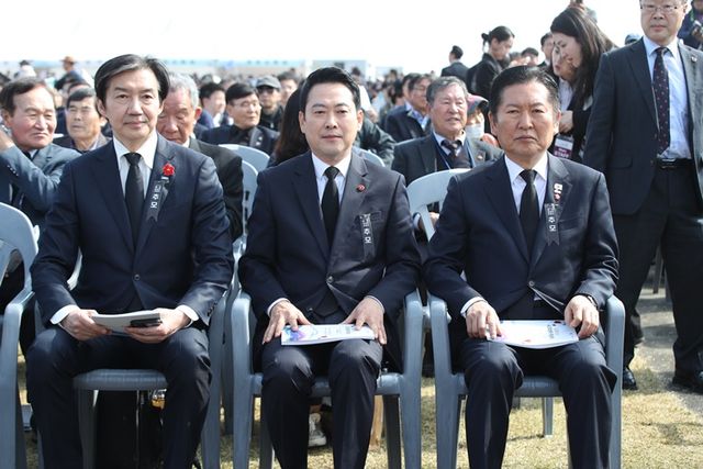 제주 출신 정춘생 국회의원과 함께 참석한 조국 조국혁신당 대표는 "4·3의 완전한 해결, 진상 규명, 피해보상, 복권 등에 대한 논의를 해왔다"며 "우리 당 정춘생 의원이 왜곡 혐의 허위사실 유포에 대해서 처벌할 수 있도록 하는 법안을 가장 먼저 발의했다"고 밝혔다.