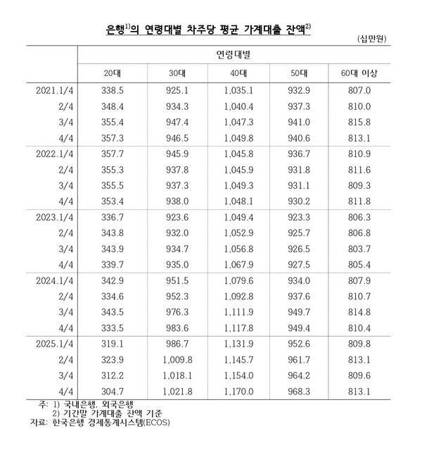 30대 대출 잔액은 2023년 말 9천350만원에서 2024년 말 9천836만원으로 증가한 데 이어 지난해 1억원을 처음 돌파하며 2년 연속 증가세를 이어갔다. 40대도 역대 최대를 기록했다. 지난해 말 40대 1인당 대출 잔액은 1억1천700만원으로 1년 전보다 522만원 늘었으며, 2022년 말 이후 3년 연속 오름세가 지속됐다.