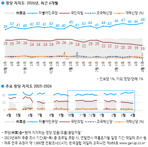 한국갤럽이 지난달 31~4월 2일 전국 만 18세 이상 남녀 1001명을 대상으로 정당 지지율 조사를 실시한 결과(95% 신뢰수준에 ±3.1% 포인트) 민주당 48%, 국민의힘 18%, 개혁신당 2%, 조국혁신당 1%, 진보당 1% 등으로 나타났다.