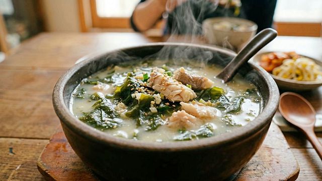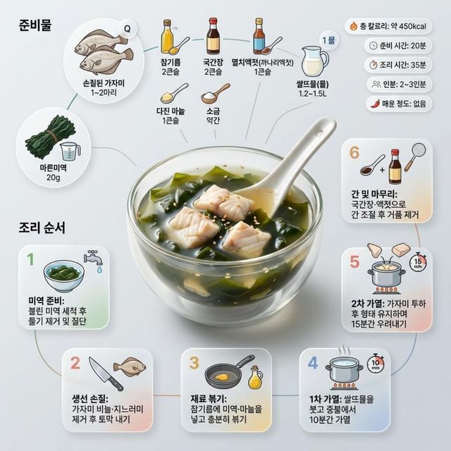 조리법은 어렵지 않다. 마른미역 20g을 찬물에 20분 불린 뒤 박박 씻어 물기를 짜고 먹기 좋은 크기로 썬다. 손질된 가자미는 지느러미를 제거하고 2~3토막으로 자른다. 냄비에 참기름 2큰술을 두르고 불린 미역과 다진 마늘 1큰술을 넣어 미역 색이 선명해질 때까지 충분히 볶는다. 이 과정이 국물을 뽀얗게 우러나게 하는 핵심이다. 쌀뜨물 1.2~1.5L를 붓고 센 불에서 끓인 뒤 중불로 줄여 10분 끓이고, 가자미를 넣어 10~15분 더 끓이면 국물이 우윳빛으로 변한다. 국간장 2큰술과 멸치액젓 1큰술로 간을 맞추고 소금으로 마무리하면 된다.