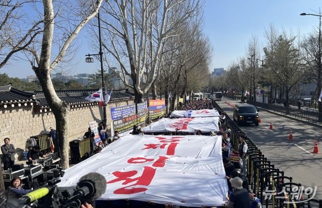 2일 서울 종로구 청와대 앞에서 HMM 노동조합이 결의대회를 진행하고 있다. 사진=이건우 기자