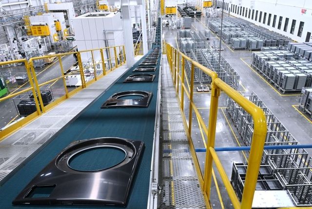 LG전자 미국 테네시 공장에서 세탁기 커버가 공중 컨베이어를 통해 다음 공정 라인으로 이동하고 있는 모습. ⓒ LG전자