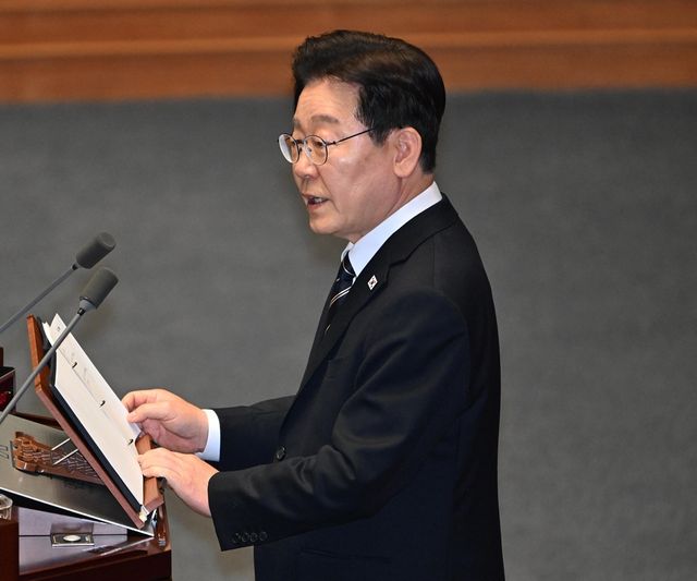 이재명 대통령이 2일 국회 본회의장에서 중동 사태 대응을 위한 추가경정예산안 관련 시정연설을 하고 있다. / 뉴스1