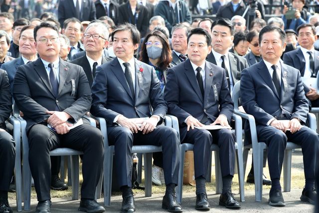 천하람 개혁신당 대표(왼쪽부터), 조국 조국혁신당 대표, 장동혁 국민의힘 대표, 정청래 더불어민주당 대표가 3일 오전 제주4·3평화공원에서 열린 제78주년 4·3 희생자 추념식에 참석하고 있다. / 뉴스1