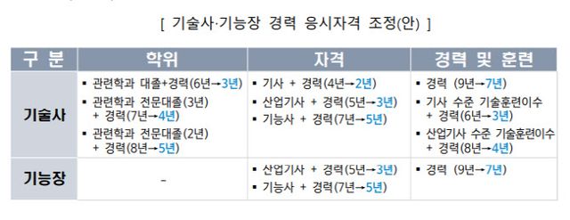 정부는 이에 따라 기술사·기능장 등 최상위 자격의 경력 요건을 대폭 완화한다. 최대 9년에 달하는 경력 기준을 7년 수준으로 낮추고, 기사·산업기사 취득자 등의 추가 경력 요건도 2~4년씩 단축한다. 이를 통해 청년층의 조기 진입을 유도한다는 계획이다.