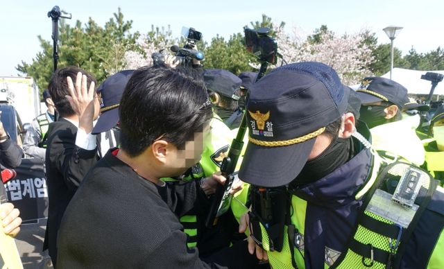 3일 오전 제78주년 4·3 추념식이 열린 제주4·3평화공원 앞에서 일부 극우 유튜버들과 4·3단체가 동시에 집회를 진행하면서 경찰이 충돌을 막고 있다. 양유리기자