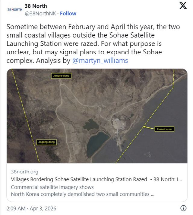 3일(현지시간) 블룸버그통신에 따르면 스팀슨센터 산하 북한 전문 연구기관 ‘38노스’는 이날 공개한 보고서에서 북한 서부 해안에 위치한 서해위성발사장(철산군 동창리) 인근 마을 2곳의 건물 수백채가 지난달 철거됐다고 밝혔다. 위성사진 분석 결과 평안북도 철산군에 속한 자강동과 장야동 두 마을이 지도에서 완전히 사라진 것으로 나타났다.