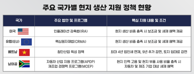 재계 등에 따르면 미국의 인플레이션 감축법(IRA)과 유럽의 핵심원자재법(CRMA)은 현지 생산 비중이 낮은 기업을 보조금 대상에서 제외한다. 베트남은 첨단산업 육성을 위해 자국 내 생산법인을 설립할 경우 최대 4년간의 법인세 면제와 9년간의 추가 감면, 토지 임대료 감면 등 전폭적인 지원책을 제공한다. 반도체와 배터리 등 미래 핵심 산업 분야에는 별도의 추가 보조금까지 지급한다. 남아프리카공화국 또한 자동차 산업 지원 프로그램(APDP)과 제조업 경쟁력 프로그램(MCEP)을 통해 현지 생산 기업에 상당한 보조금과 세제 혜택을 부여한다. 이러한 혜택들의 전제 조건은 현지 인력 고용과 현지 부품 사용 비율 충족이다.