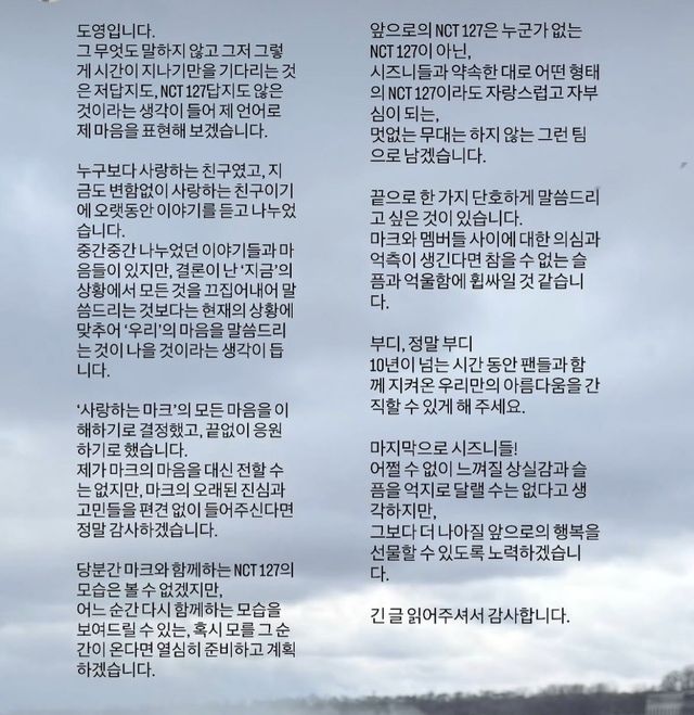 (엑스포츠뉴스 정민경 기자) NCT 127 도영이 마크의 탈퇴 관련 장문의 심경 글을 게재했다.