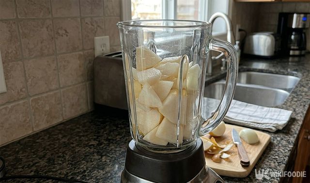 3. 배와 양파를 적당한 크기로 썰어 믹서기에 넣고 노가리 육수, 새우젓, 생강과 함께 간다.