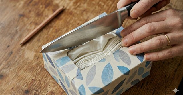 방법은 간단하다. 먼저 갑티슈 박스의 옆면을 열어준다. 박스는 그대로 재사용할 것이기 때문에 망가지지 않도록 조심스럽게 개봉하는 것이 포인트다. 안에 들어 있는 티슈 묶음을 꺼낸 뒤, 칼로 가운데를 잘라 이등분한다.