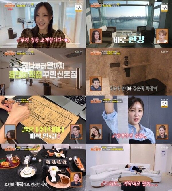 공개된 효민의 신혼집은 마치 고급 카페를 옮겨놓은 듯한 한강뷰 테라스가 압권이었다. 특히 효민의 감각적인 취향이 반영된 인테리어가 눈길을 끌었는데, 변기부터 화장지까지 모두 블랙 컬러로 맞춘 파격적인 화장실 디자인은 출연진들의 감탄을 자아냈다. 해당 주거 공간은 현재 시세 100억 원대를 호가하는 최상위급 아파트로 알려져 더욱 화제를 모으고 있다.