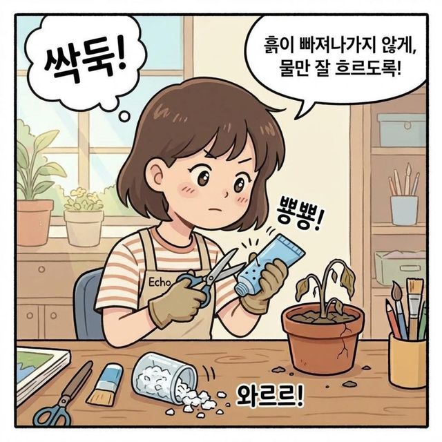 방법은 다음과 같다. 튜브 하단(입구 반대편)의 납작한 밀봉 부분을 가위로 약 1~2cm 잘라내거나, 바닥면에 3~4개의 배수 구멍을 낸다. 이때 구멍의 크기는 흙이 빠져나가지 않으면서 물만 흐를 수 있도록 지름 2~3mm가 적당하다. 튜브는 바닥면이 좁으므로 배수 구멍이 막히기 쉽다. 흙을 채우기 전, 가장 밑바닥에 잘게 부순 스티로폼 조각이나 작은 자갈을 1cm 정도 깔아주면 물 빠짐에 도움이 된다.