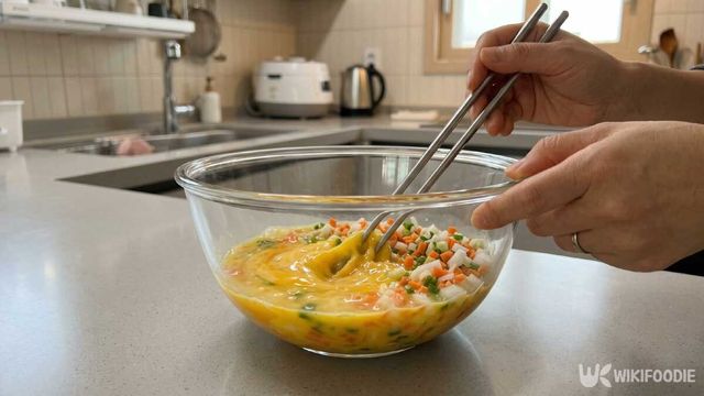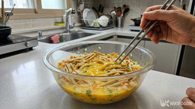 준비한 채소와 어묵을 넣고 가볍게 섞는다. 너무 오래 섞으면 수분이 빠질 수 있으니 짧게 섞는 것이 좋다.