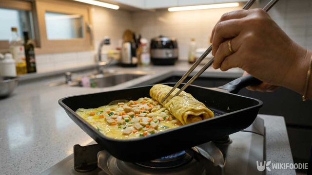 첫 번째 층이 반 정도 익었을 때부터 말기 시작한다. 완전히 익기 전에 말아야 층이 자연스럽게 이어진다. 한 번 말아둔 뒤 옆으로 밀고, 다시 계란물을 부어 이어서 말아준다. 이 과정을 3~4번 반복하면 두툼하게 완성된다.