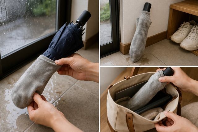 비가 많이 오는 날, 젖은 우산을 실내로 들여올 때 발생하는 물기 문제는 헌 양말 한 켤레로 해결 가능하다. 우산을 접은 상태에서 헌 양말을 우산 끝부분부터 씌워주면 양말의 섬유가 빗물을 빠르게 흡수하여 바닥에 물이 떨어지는 것을 막아준다.
