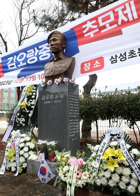 12일 오전 경남 김해시 삼정동 삼성초등학교 옆 김오랑 중령 흉상 앞에 국화가 놓여 있다. 영화 '서울의 봄'에서 배우 정해인이 열연한 오진호 소령의 실제 인물인 김 중령은 12·12 군사반란 때 정병주 특전사령관을 불법체포하기 위해 사령부에 들어온 신군부 측 군인들에 맞서 홀로 교전하다 자정을 넘긴 13일 오전 0시20분께 M16소총 6발을 맞고 숨졌다. 사망 당시 34세로 계급은 소령이었다. 사후 10여 년간 추서되지 못하다 1990년 중령으로 추서됐다. 2023.12.12 / 뉴스1