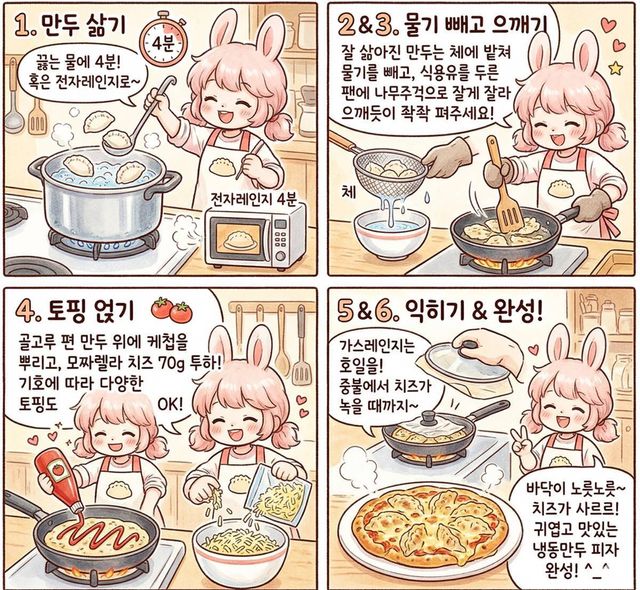 완성된 만두 피자는 겉은 바삭하고 속은 촉촉한 식감이 특징이다. 뚜껑을 덮지 않고 조리하는 이유도 습기를 날려 크리스피한 질감을 살리기 위해서다. 맛은 한국식 콤비네이션 피자와 흡사하다. 별도의 설거지도 거의 없고, 조리 시간도 짧아 자취생이나 간단한 한 끼를 원하는 1인 가구에게 적합한 메뉴다.
