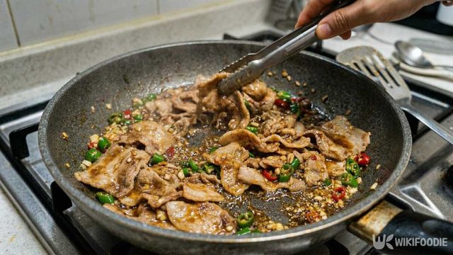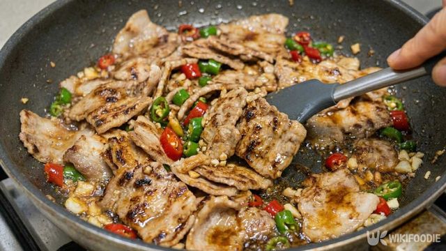 고기의 색이 변하면 준비해둔 양념을 넣어 가볍게 섞는다. 이어서 썰어둔 고추를 넣고 짧게 볶아 향을 더한다. 이때 오래 익히기보다는 빠르게 마무리하는 것이 맛을 살리는 데 도움이 된다.