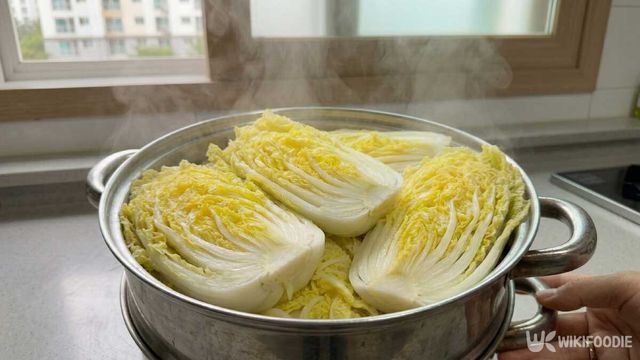 이제 조리를 시작한다. 먼저 넓은 냄비에 물을 소량 넣은 뒤 알배추를 차곡차곡 올린다. 이때 줄기 부분이 아래로 향하도록 놓으면 익는 정도가 고르게 맞는다. 뚜껑을 덮고 중불에서 약 6~7분 정도 익히면 배추가 부드럽게 숨이 죽는다.