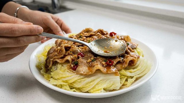 ⑦ 배추 위에 고기를 올리고 참기름을 둘러 완성한다.