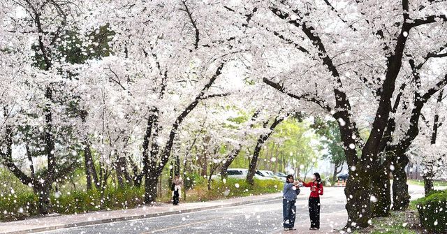 지난 3일 봄바람 불어오는 영남대 경산캠퍼스에 핀 벚꽃과 휘날리는 꽃비. / 뉴스1