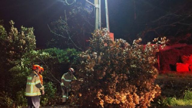 또 이날 오전 3시17분께 서귀포시 서홍동에서는 전신주 단자에서 스파크가 발생하는가 하면 제주시 한림읍 도로에서는 강풍에 나무가 쓰러지기도 했다.