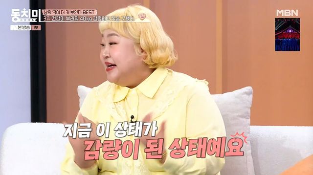홍윤화는 "그냥 앉아서 얘기하는 데도 꽉 닿았다. 자다가도 안 되겠다 싶었다. 가위에 눌린 것 같은 느낌이었다. 그래서 감량해야겠다고 해서 감량이 된 상태다"라며 "40kg을 뺐다. 덤프트럭만했는데 승합차만해진 것"이라고 말했다.