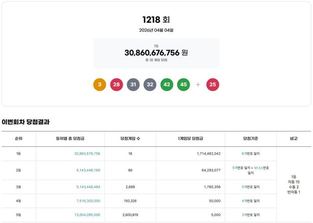 동행복권은 지난 4일 진행된 추첨에서 1등 당첨 번호가 '3·28·31·32·42·45'로 결정됐다고 밝혔다. 2등 보너스 번호는 '25'다. 당첨 번호 6개를 모두 맞힌 1등 당첨자는 총 18명이며, 이들은 각각 17억 1448만 2042원의 당첨금을 받는다.