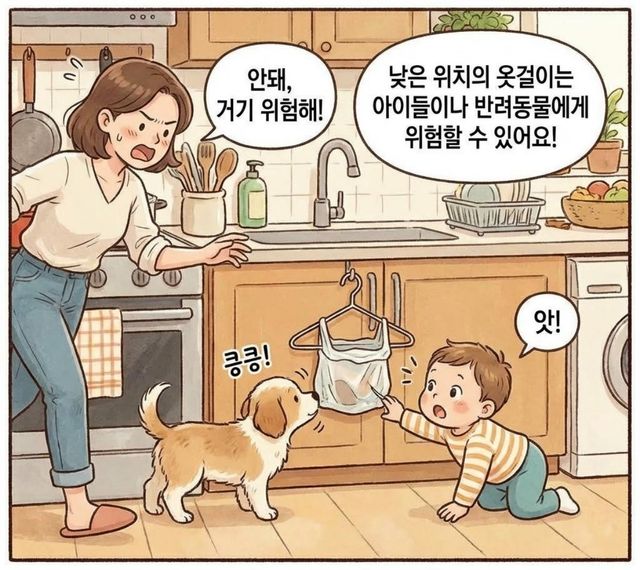 옷걸이를 개조해 만든 간이 쓰레기통이나 수납함은 대개 낮은 위치(싱크대 문, 손잡이 등)에 설치된다. 호기심 많은 아이들이나 반려동물이 튀어나온 와이어 끝부분에 찔리거나 입에 넣지 않도록 설치 높이를 조절해야 한다.