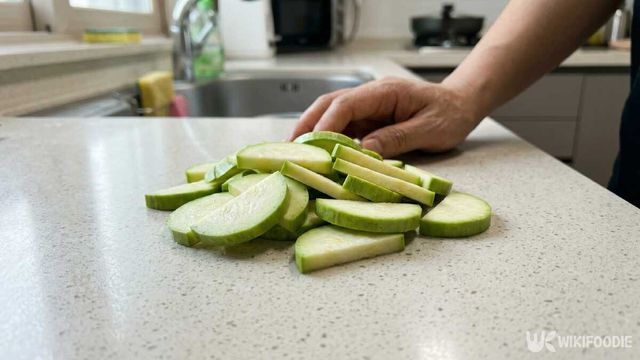 ② 애호박은 반으로 갈라 0.5cm 두께의 반달 모양으로 썬다.
