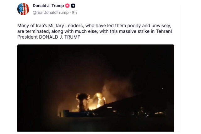 트럼프 대통령은 이어 같은날 추가로 1분가량의 이란 폭격 영상을 올리며 "이번 테헤란 대규모 공습으로 이란군을 형편없고 현명치 못하게 이끌어온 지도부 다수가 또다른 많은 이들과 함께 끝장났다(terminated)"고 했다.