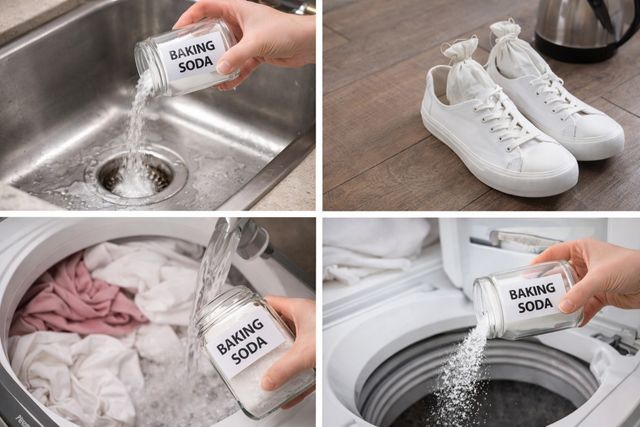 싱크대나 욕실 배수구에서 올라오는 악취는 베이킹소다와 뜨거운 물의 조합으로 해결 가능하다. 배수구에 베이킹소다 반 컵을 먼저 뿌린 뒤, 그 위에 식초를 붓거나 뜨거운 물을 천천히 부어주면 거품이 발생하며 배수관 벽면에 붙은 오염물을 씻어내린다.