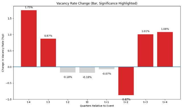 다만 이 효과가 장기적으로 지속되는가에 대해서는 ‘유의하지 않다’고 볼 수 있었습니다. 추경 후 9개월부터는 통계적 유의성이 사라졌고, 대세에 맞게 공실률은 다시 오르는 모습을 보였습니다.