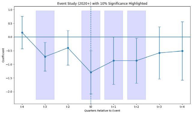 이런 경향성은 코로나19 위기와 금리 상승기였던 2020~2025년 동안 더 두드러졌습니다. 추경 전과 후에 있어서 효과성이 그 이전 시기(2015~2019년)보다 뚜렷했습니다. 추경 직후부터 6개월까지는 ‘통계적으로 유의하게’ 소규모 상가 공실률 증감률에 영향을 줬습니다. 그 이후도 ‘통계적으로 유의하지 않을 뿐’ 공실률 증가율은 둔화되는 모습이었습니다.