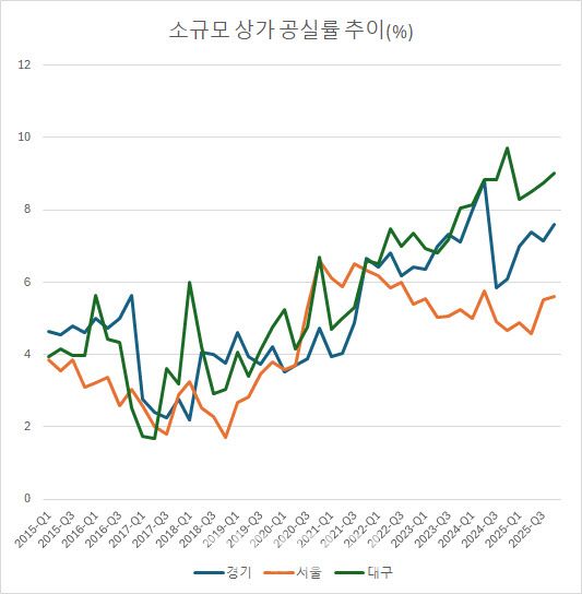 추경의 효과성을 살펴보기 전 소규모 상가 공실률은 어떤 흐름을 보이고 있는지 살펴볼 필요가 있습니다. 2015~2025년 동안 추세적으로 보면 전국 시도의 공실률은 오르는 추세가 더 강했습니다. 한국부동산원 자료 추이를 보면 지난 10년간 17개 시도 중 12개 시도의 공실률이 오른 것으로 나타났습니다. 대표적으로 서울은 완만한 상승세를 보였고, 울산과 경남, 인천 등은 크게 오르는 모습이었습니다.